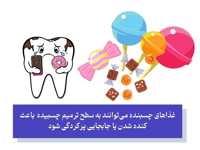 غذاهای چسبنده؛ مانند تافی، کارامل، آدامس، میوههای خشک چسبناک (مثل انجیر یا خرما) و برخی شکلاتها